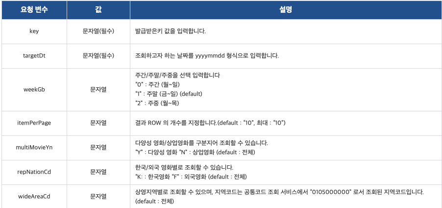 2. 모델 클래스를 만들기 위해 먼저 영화진흥위원회 API를 확인합니다.